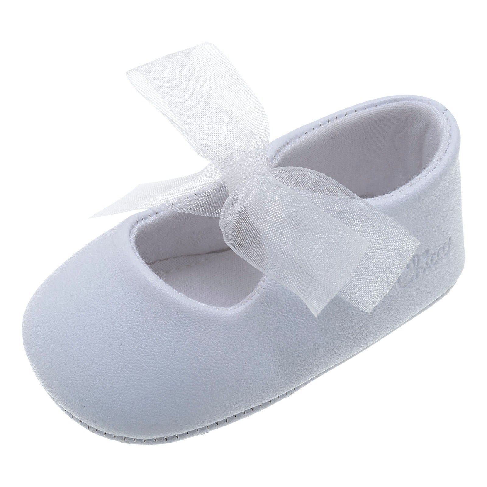 Chaussures de baptême blanches en cuir et qui se nouent avec un ruban blanc