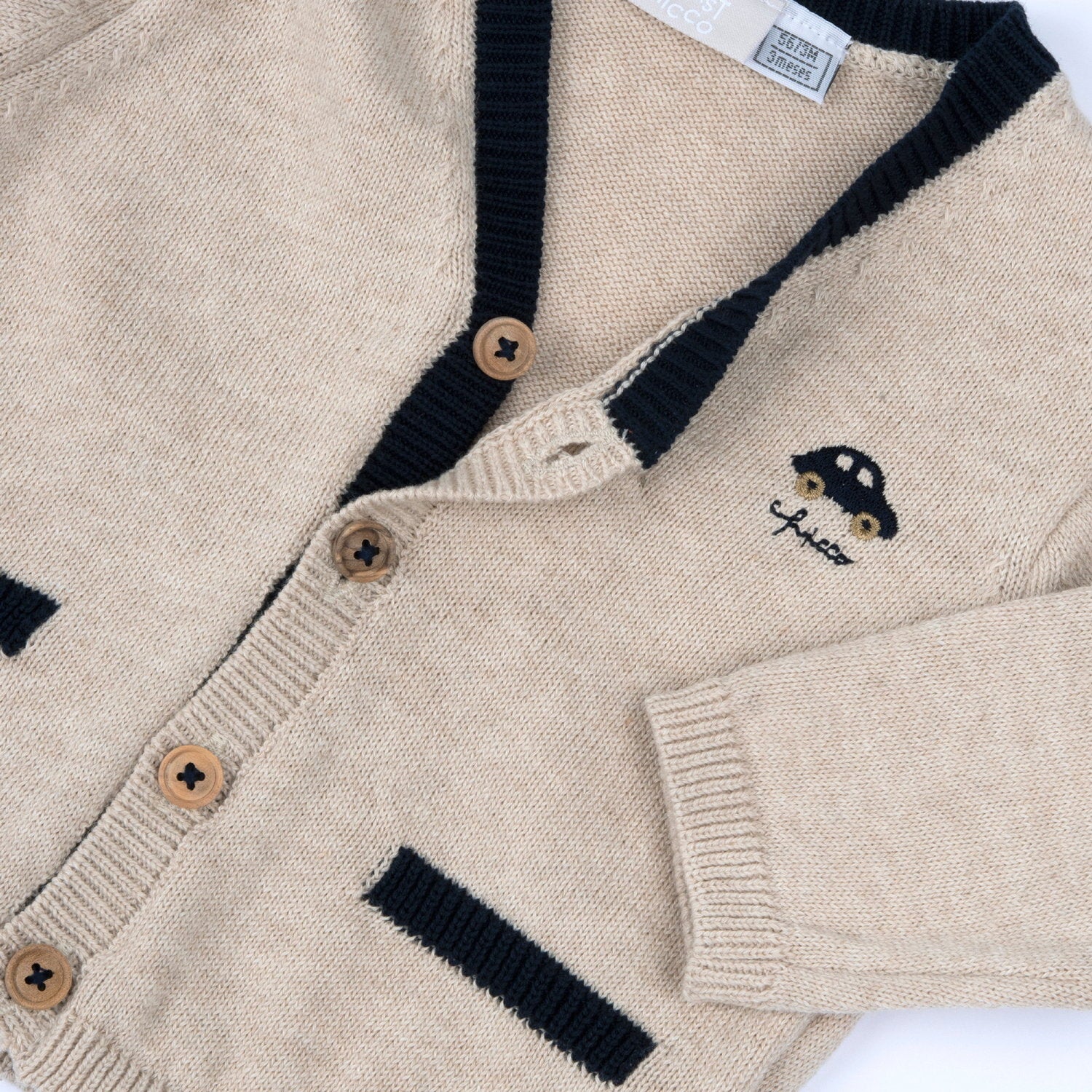 Cardigan beige avec le contour du col et des poches en noir et petite voiture brodée à gauche