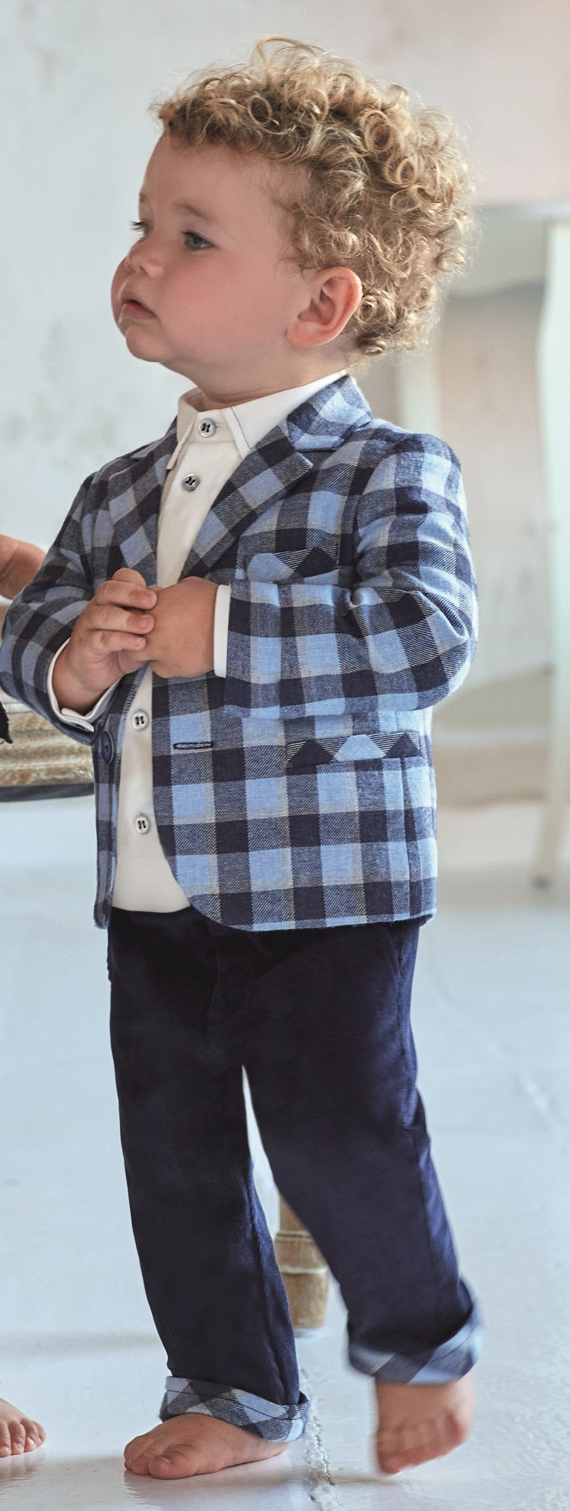 Complet bleu à carreaux avec pantalon en velours (intérieur chevilles du pantalon à carreaux comme sur le modèle)