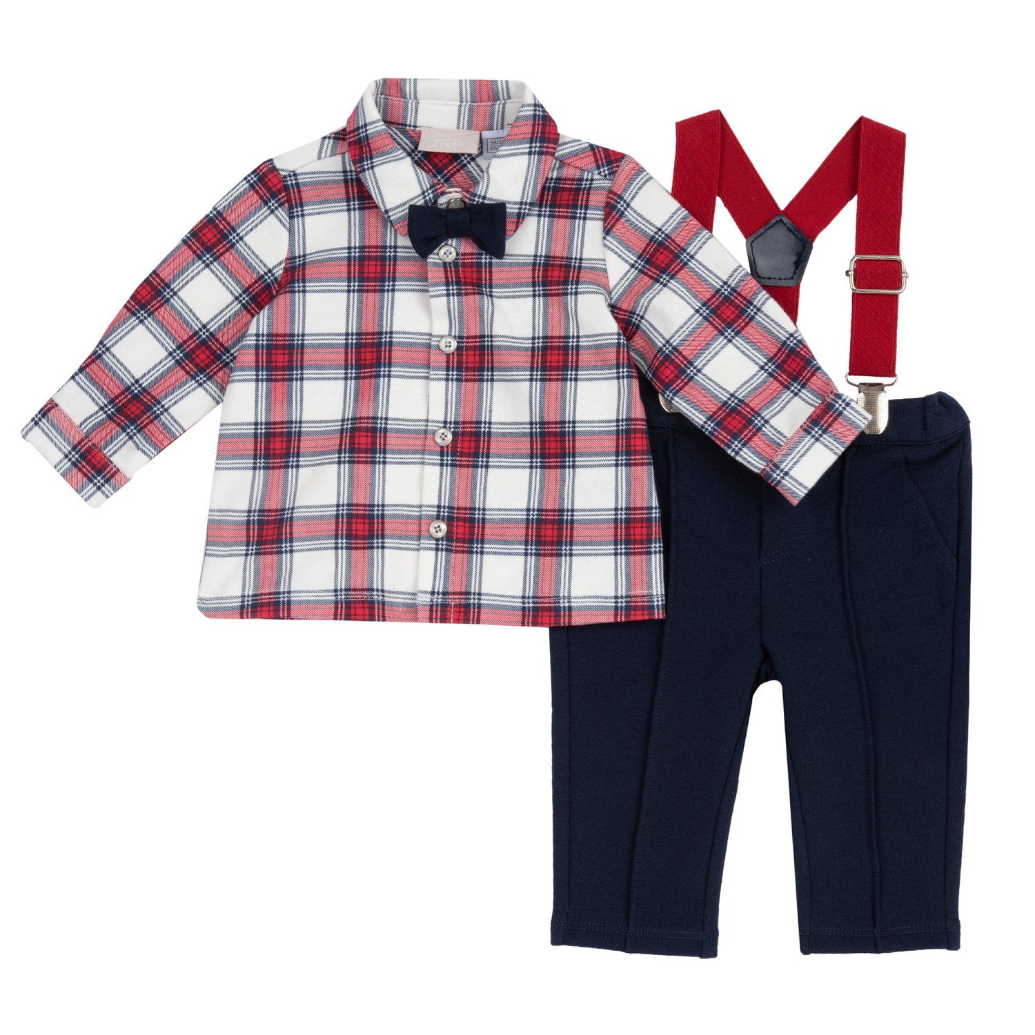 Ensemble composé d'une chemise à carreaux, d'un nœud bleu et d'un pantalon à bretelles