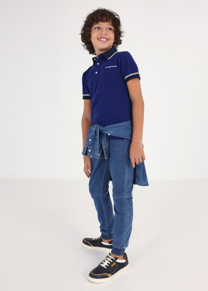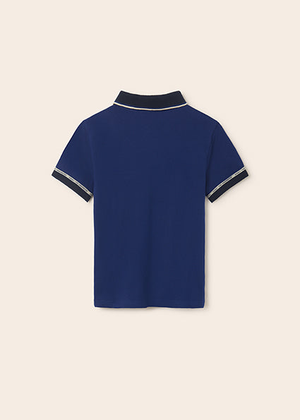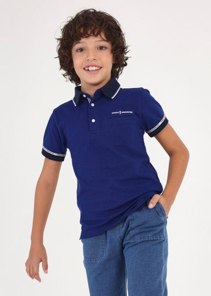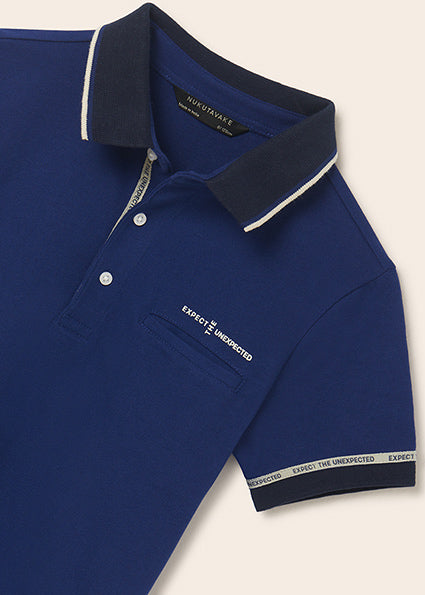 Polo bleu royal avec un col noir et l'inscription "expect the unexpected" au dessus de la poche et autour de l'extrémité des manches