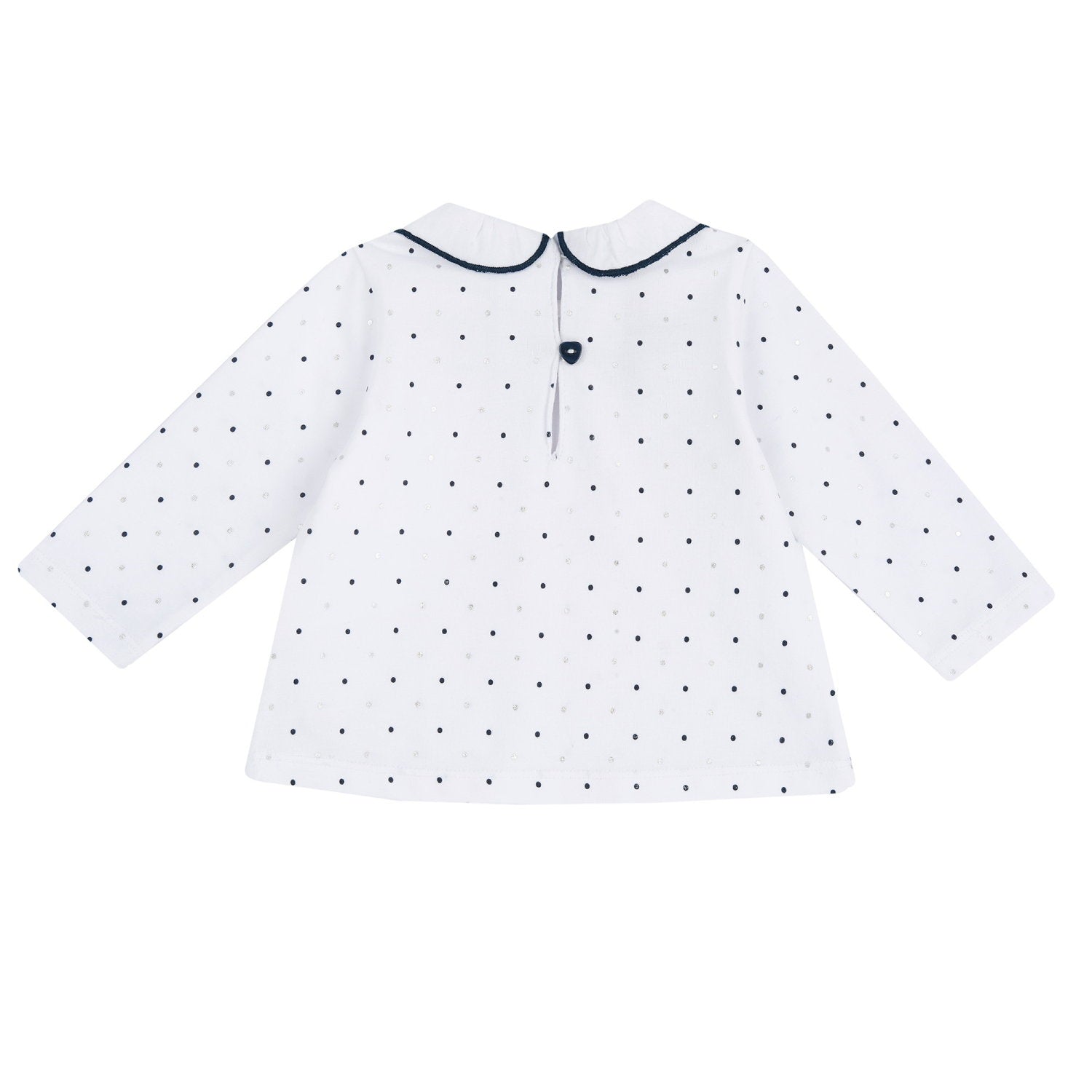 Pull blanc à manches longues avec des pois bleu foncé et argenté