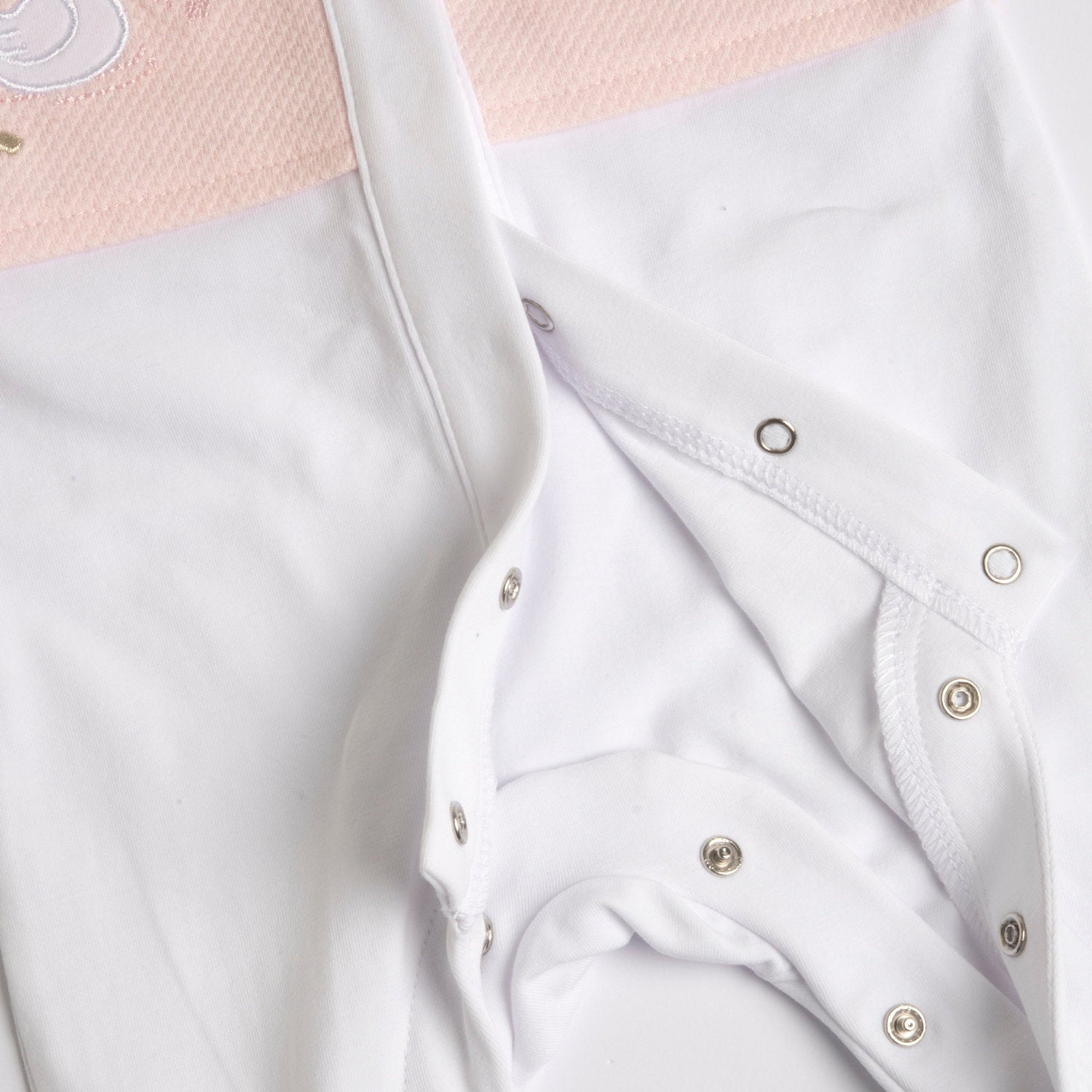 Pyjama rose et blanc avec ouverture à l'avant et à points de pression
