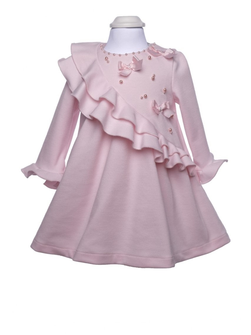 Robe de cérémonie rose avec détails sur le haut et le bas des manches.