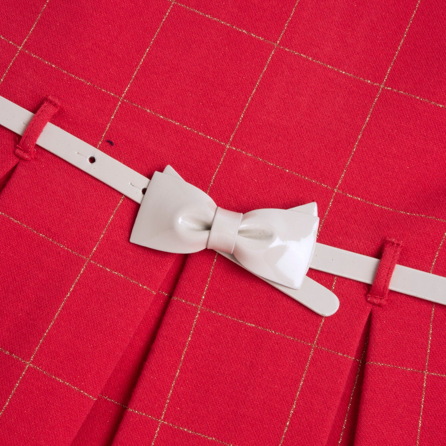 Robe rouge à carreaux fins dorés avec ceinture nœud papillon beige