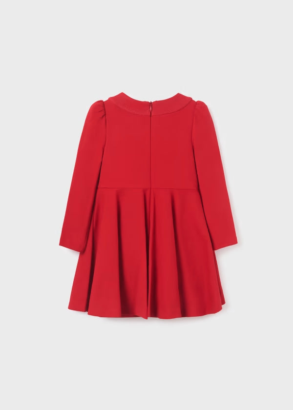 Robe rouge cintrée avec un tissus à paillettes au niveau du col surmonté d'un nœud