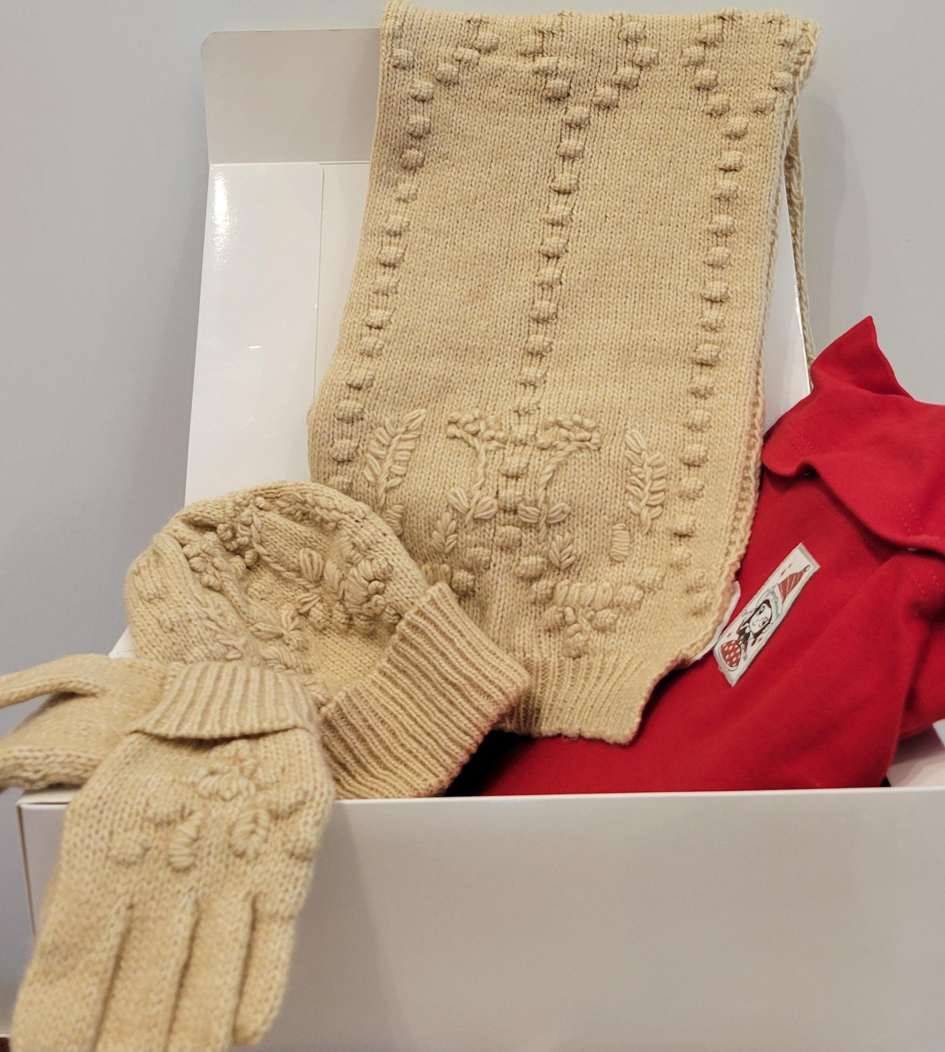 Ensemble beige assorti bonnet, écharpe et gants avec un pyjama de Noël présentés dans une jolie boîte