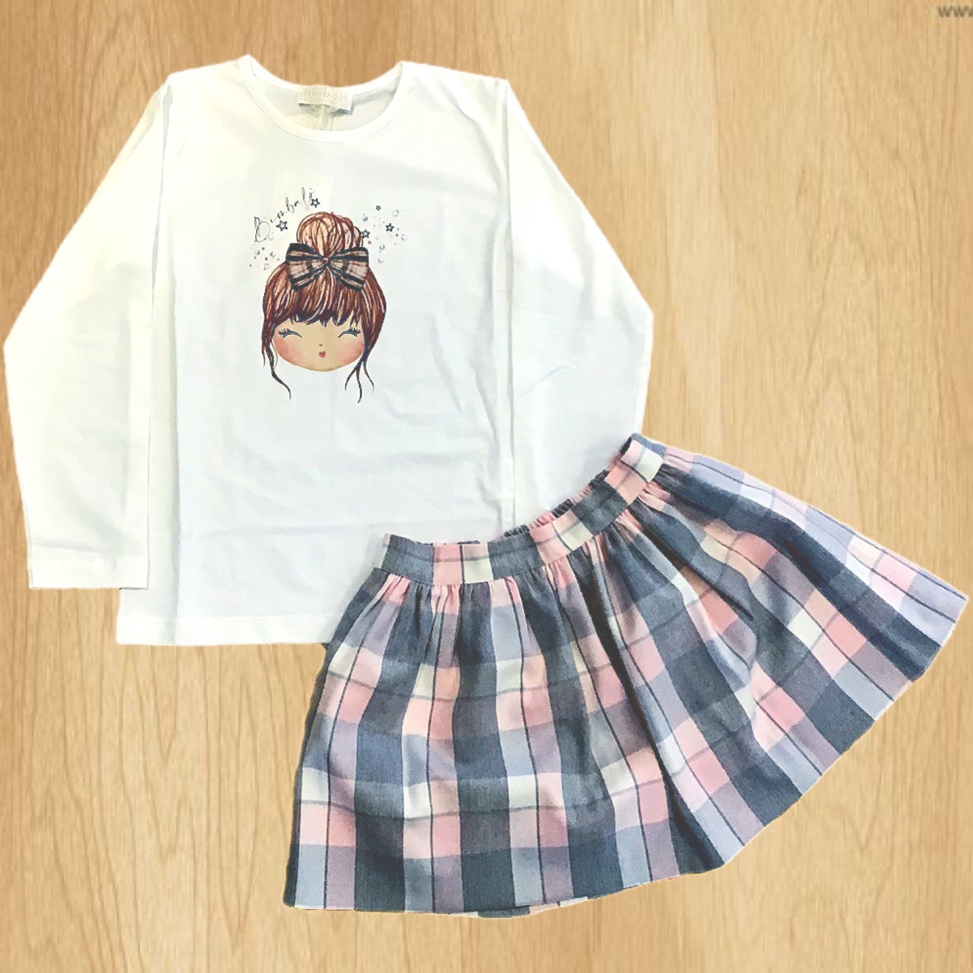 Ensemble composé d'un pull blanc avec un imprimé d'un visage et d'une jupe à carreaux grise et rose